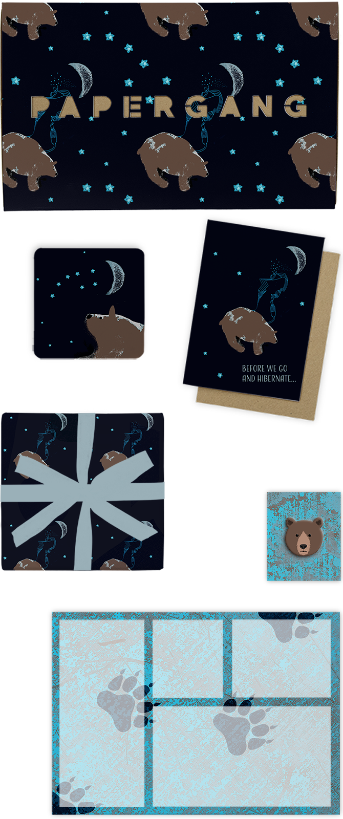 From top: The stationery box, a coaster (left), a greeting card (right), gift wrap, a pin & a desk pad.