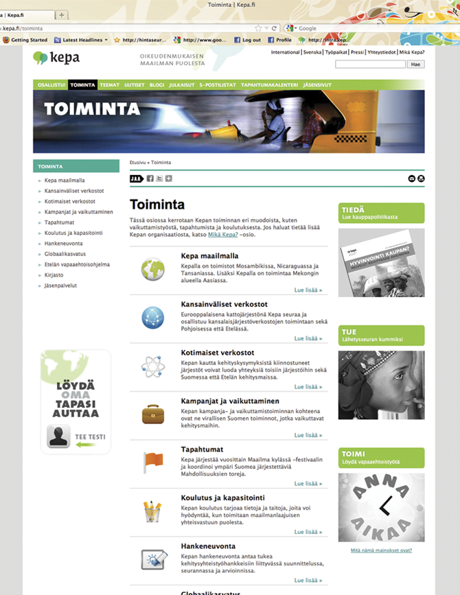 The website consists of mainly global news and information about the Finnish and international NGOs engaged in various developmential projects in Africa, Asia and South America.